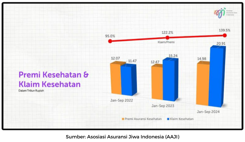 Fenomena repricing Asuransi Kesehatan di tahun ini memang cukup signifikan, hal ini disebabkan karena adanya lonjakan rasio claim. Supaya Anda punya gambaran, mari kita lihat data AAJI (Asosiasi Asuransi Jiwa Indonesia) tentang perbandingan jumlah premi yang diterima oleh perusahaan asuransi dengan jumlah claim yang dibayar oleh perusahaan asuransi di tahun 2024 ini.